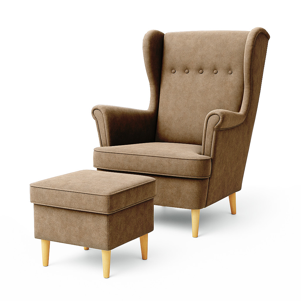 Fotel uszak Kepl + podnóżek z pojemnikiem zestaw Salvador Brown premium