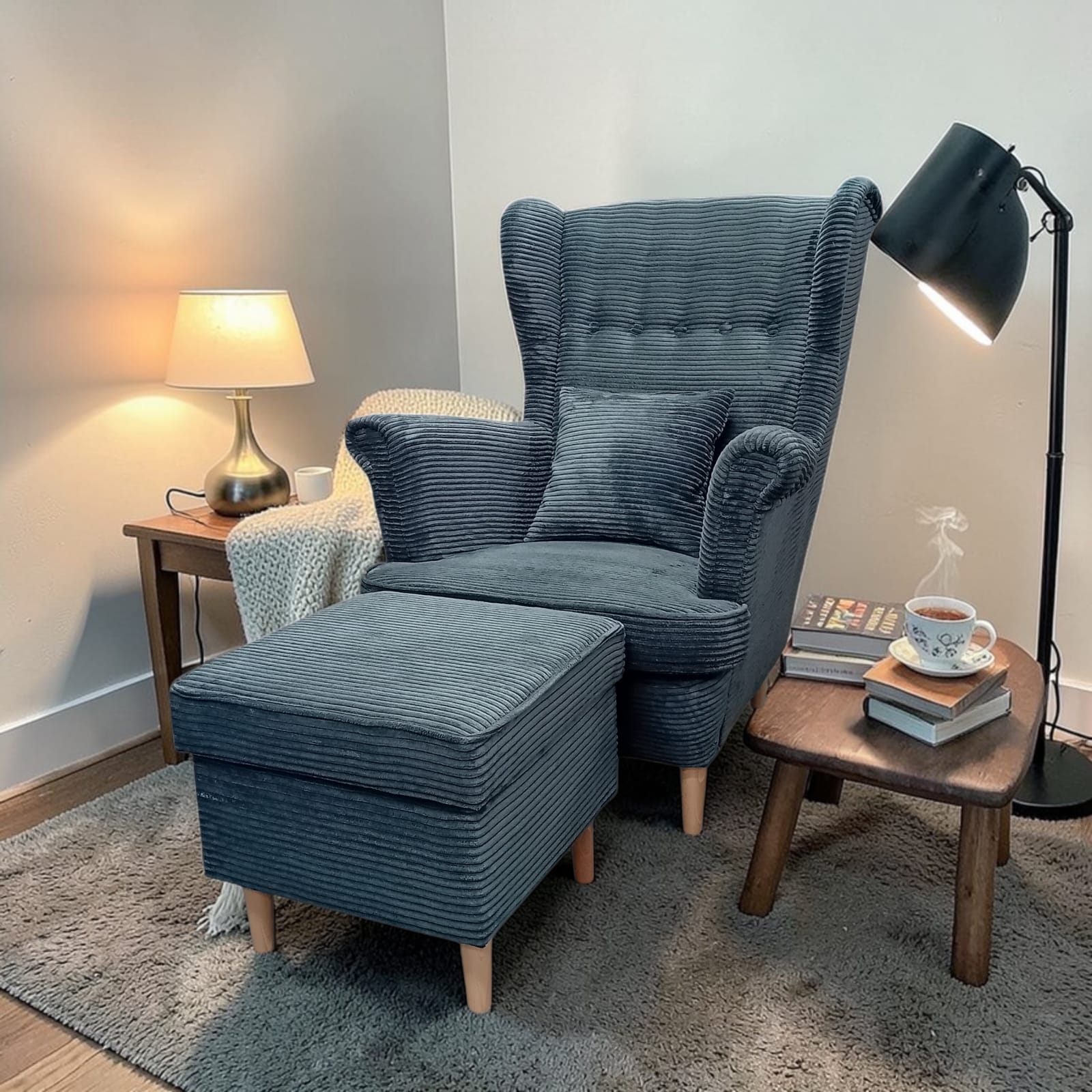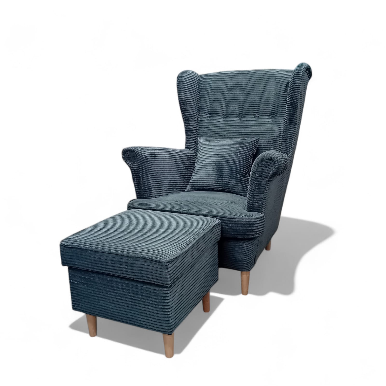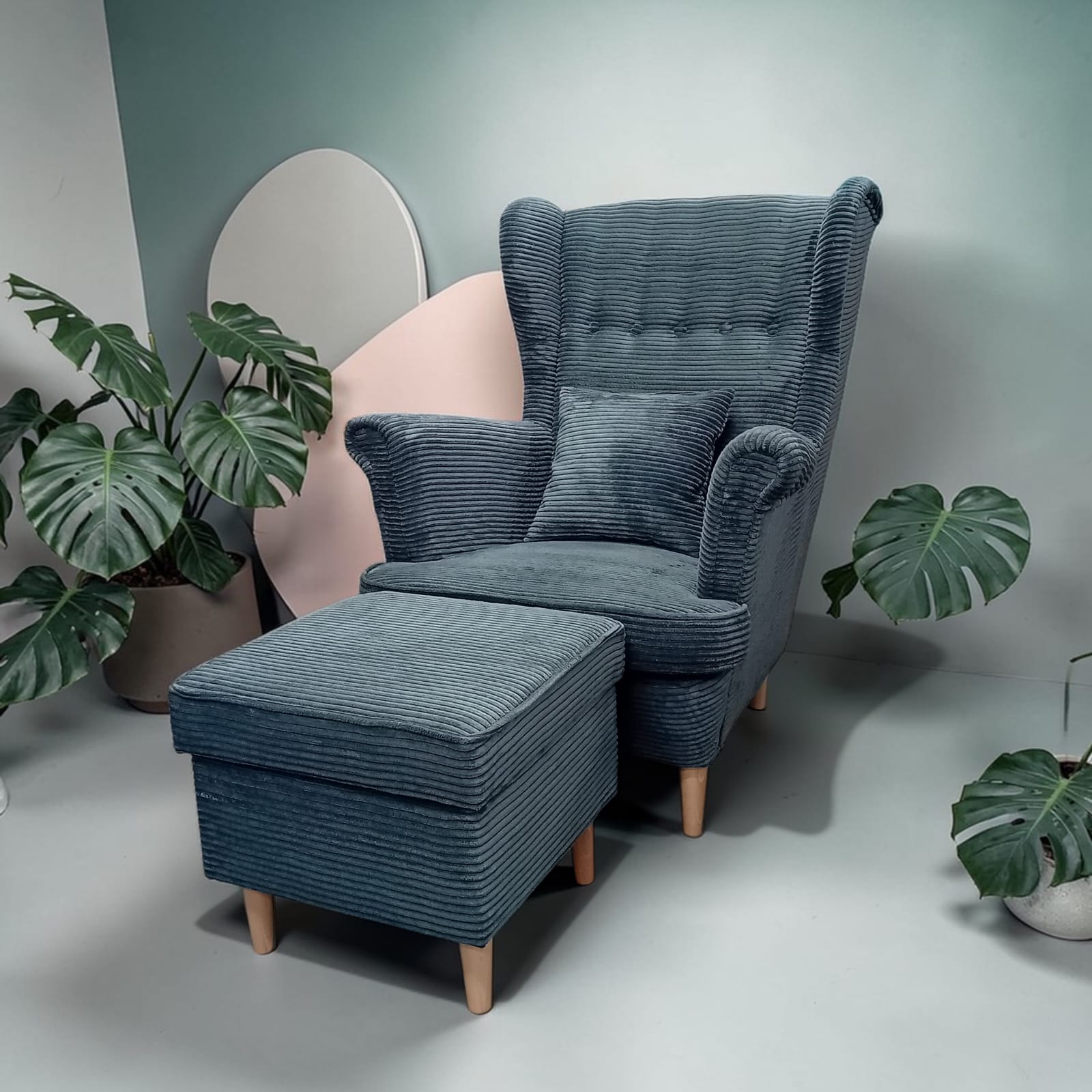 Fotel uszak Kepl + podnóżek z pojemnikiem zestaw sztruks POSO 60 szary premium