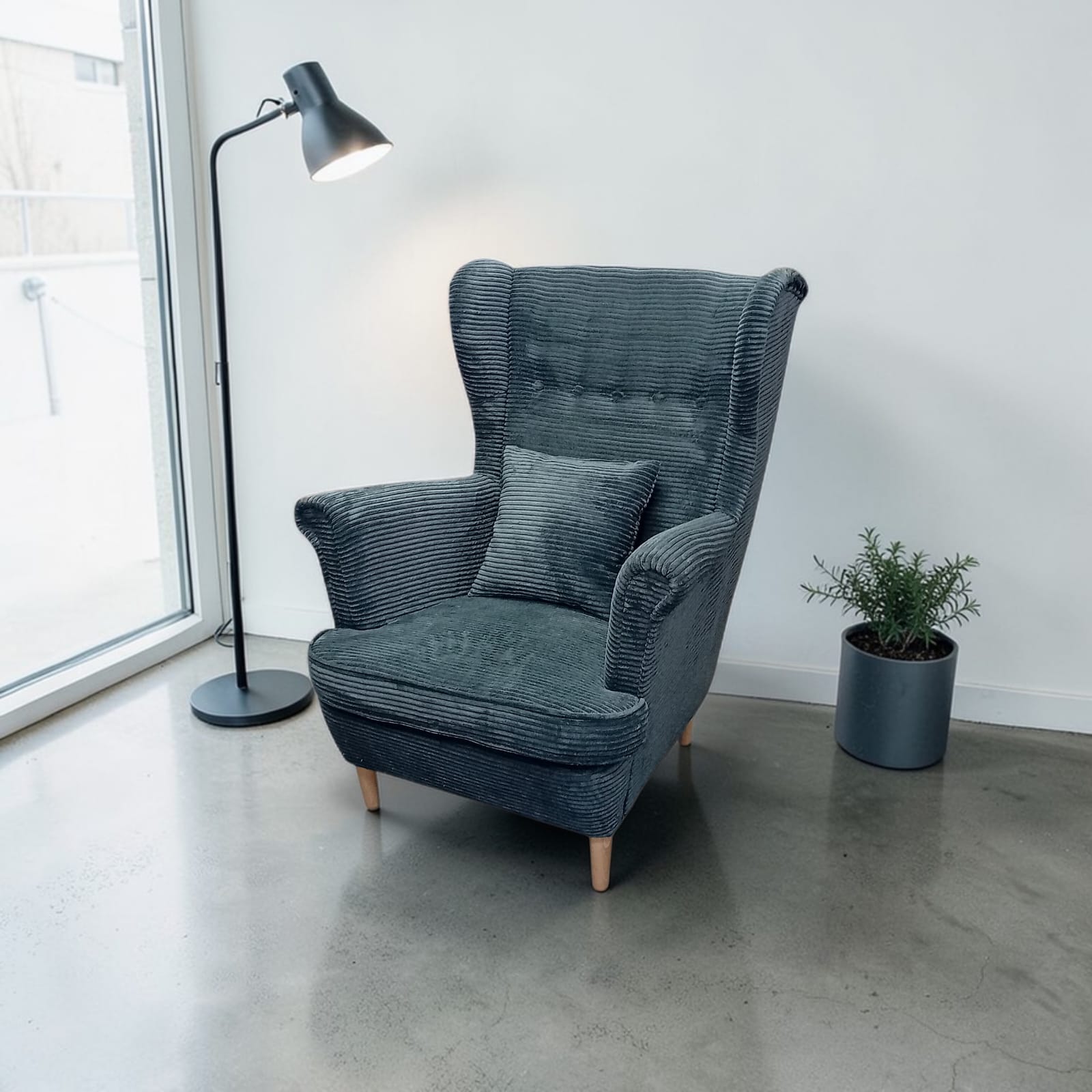 Oferta obejmuje fotel Kepl w luksusowej tkaninie sztruks POSO 60 w kolorze szarym.